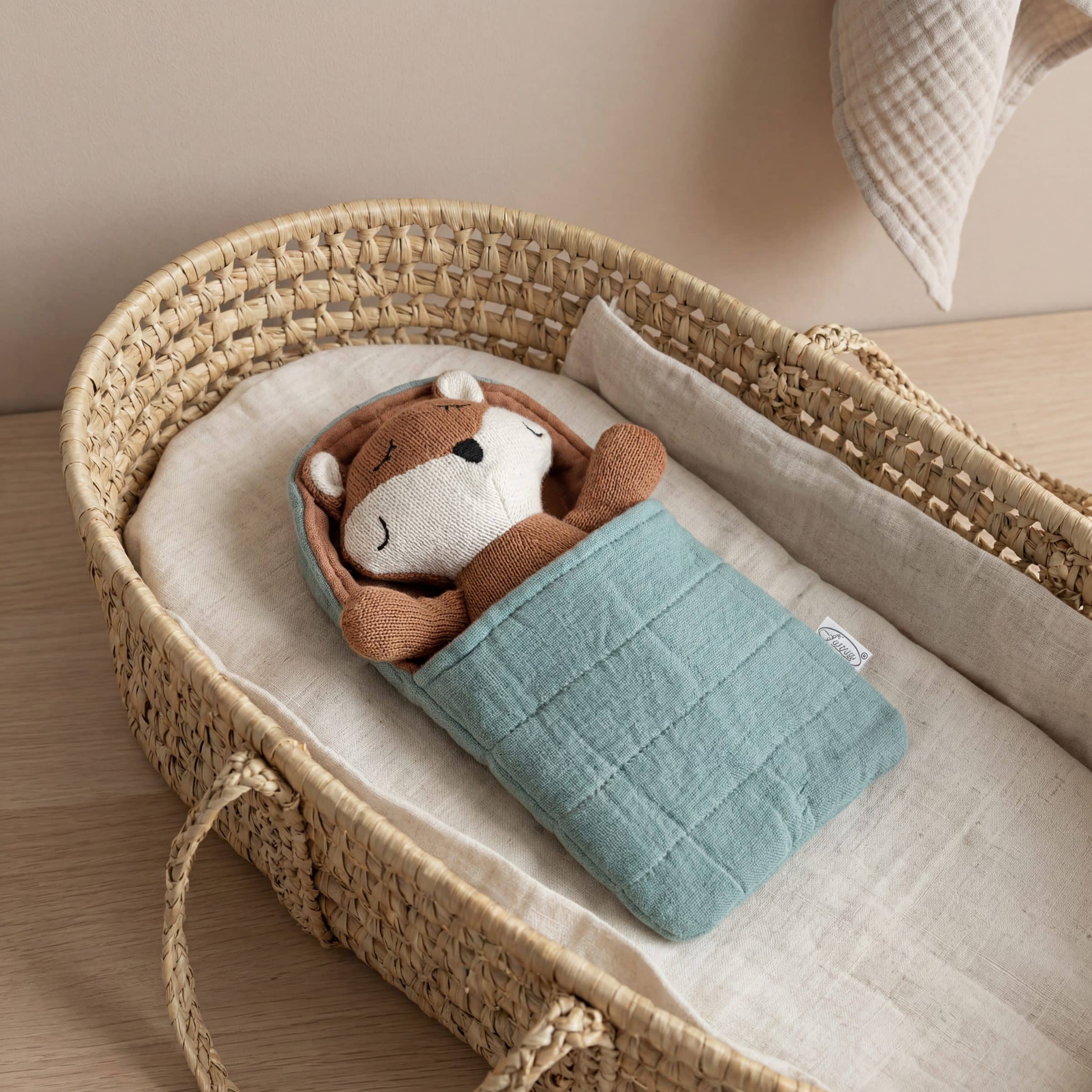 • Afmetingen knuffeltje: ± 15 x 19cm. – Slaapzakje: ± 14 x 23cm.